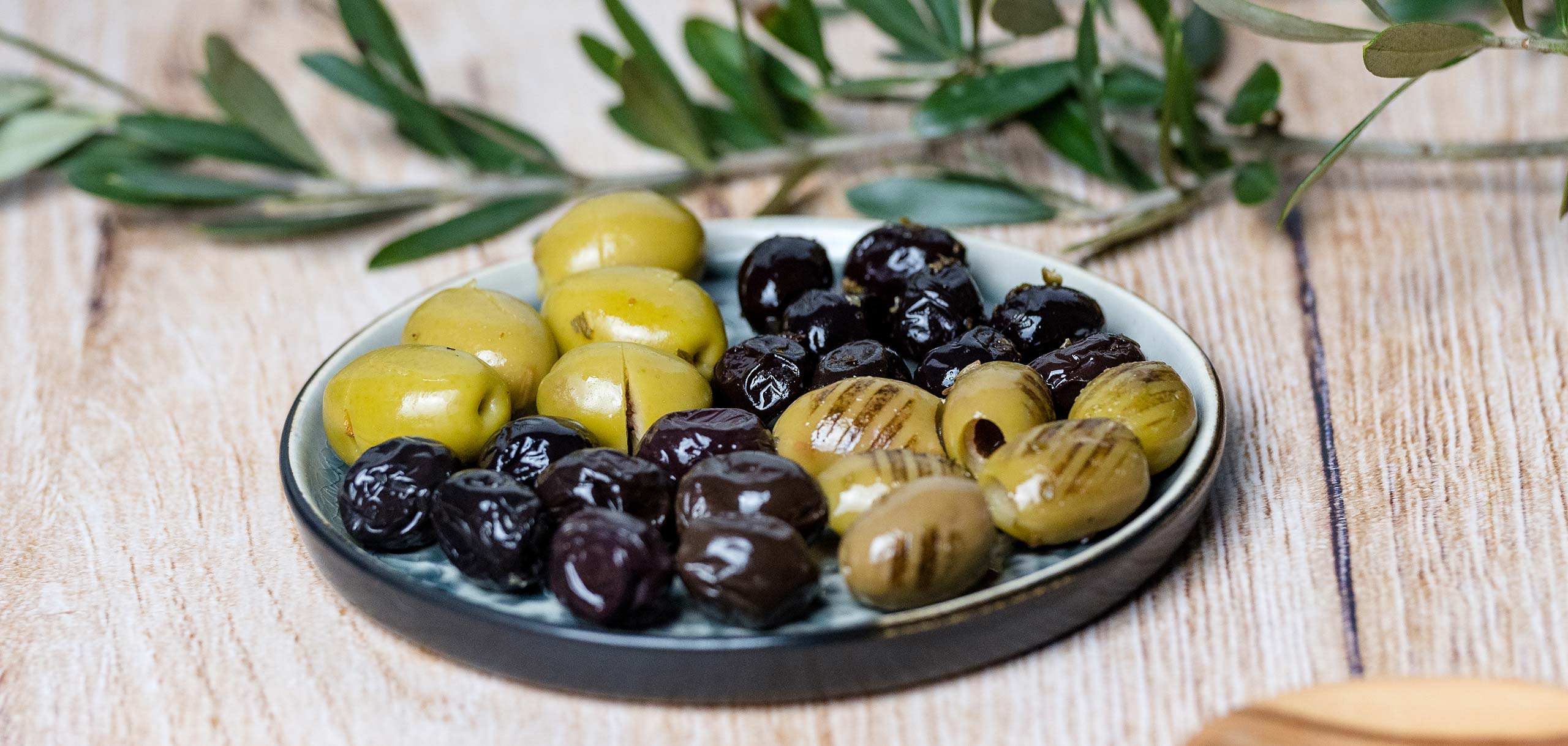 Processed pitted green olives, scratched, in brine
