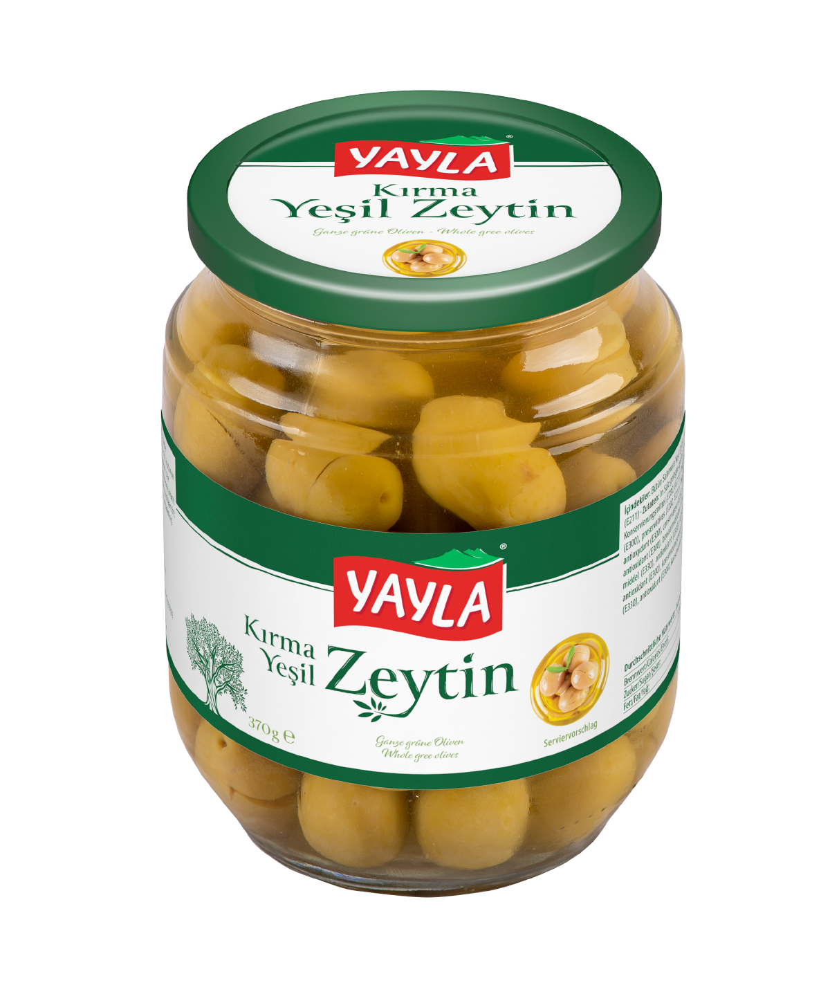 Processed pitted green olives, scratched, in brine 370g